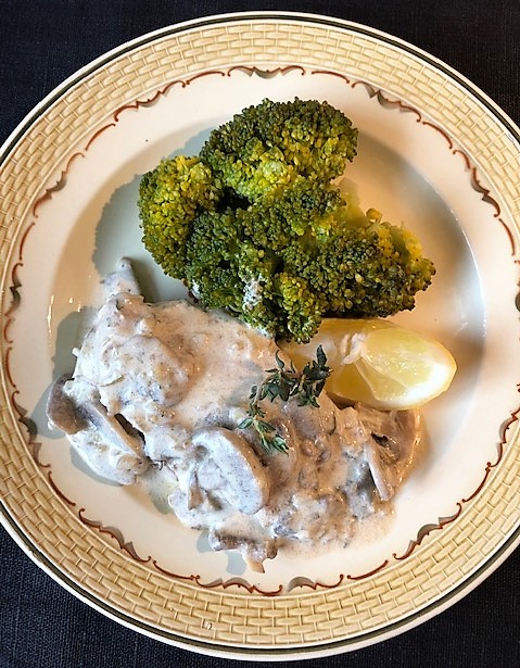 När kycklingen är färdig tillsätt även crème fraiche och repade timjanblad. Smaka av med ev. mer salt och peppar. Servera kycklingen med den kokta broccolin.