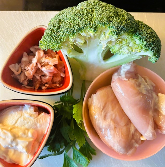 Blanda ner broccoli, kyckling och riven ost. Blanda runt ordentligt och strö på bacon. Garnera med resten av persiljan och servera.
