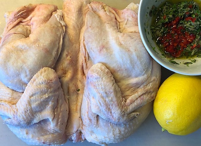 Att laga hel kyckling är både smidigt och enkelt tycker jag. Det tar lite tid så jag brukar klippa upp den vid bröstbenet och trycka ut den så den blir platt – då går det snabbare att tillaga.