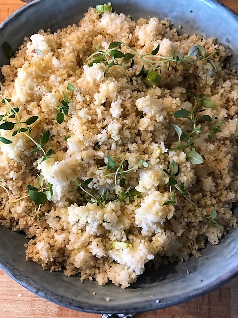 Ansa sparrisen och skär undre halvorna i skivor. Tillaga couscousen i buljong enligt instruktion på paketet och tillsätt även den skivade sparrisen. (Häll ev. även på lite olivolja blandad med färsk timjan för att få extra smak på couscousen).
