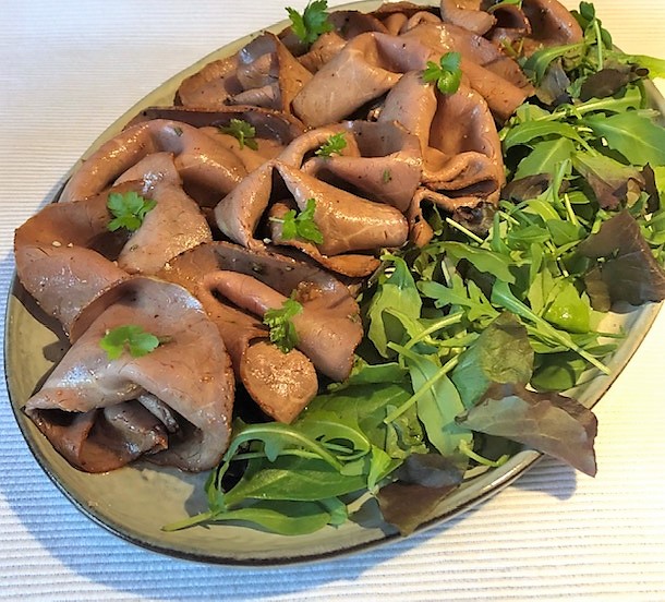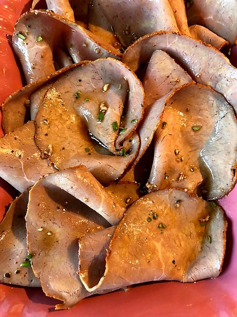 Lägg rostbiffen i en form. Blanda ihop alla ingredienserna till marinaden och häll över köttet. Låt köttet marinera tills det ska serveras helst över natten i kylskåp.