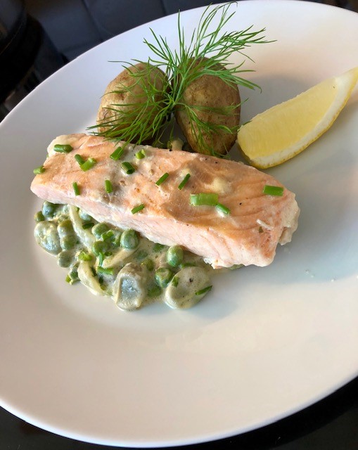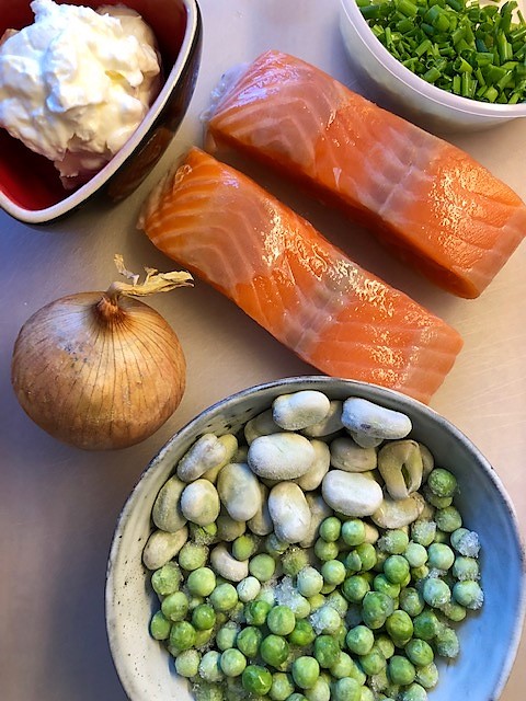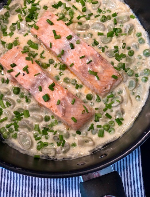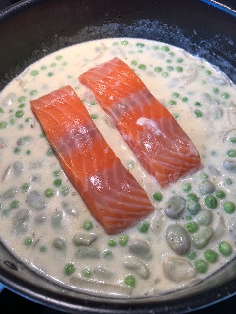 Blanda i de gröna ärtorna och bönorna. Lägg i laxen, salta och peppra lätt, på med locket och sänk värmen så att det precis sjuder i pannan. Låt småkoka i 12-15 minuter tills laxen är genomkokt.