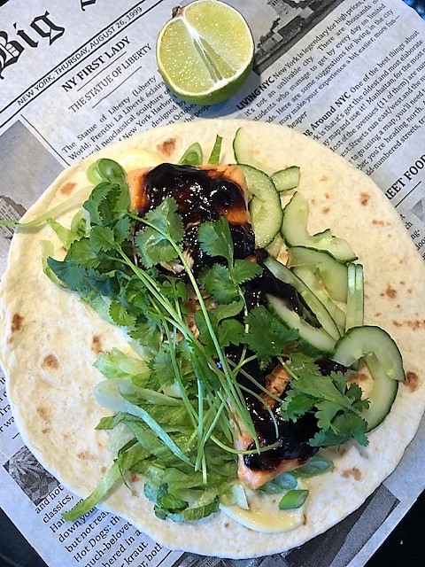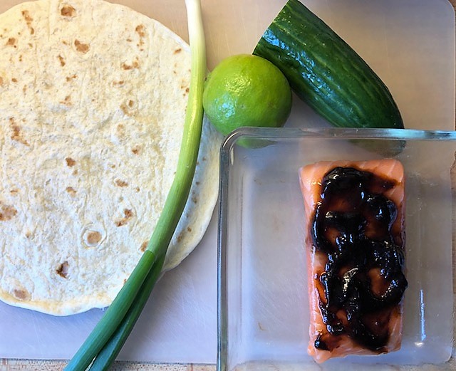 God och snabblagad lax med asiatiska smaker i en wrap. Använd de grönsaker du har hemma och tycker är goda. Man kan ju variera i det oändliga!