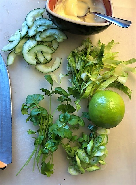 Bred wasabimajo på bröder och lägg på lax och alla grönsaker. Pressa lite lime över och rulla ihop. Klart!