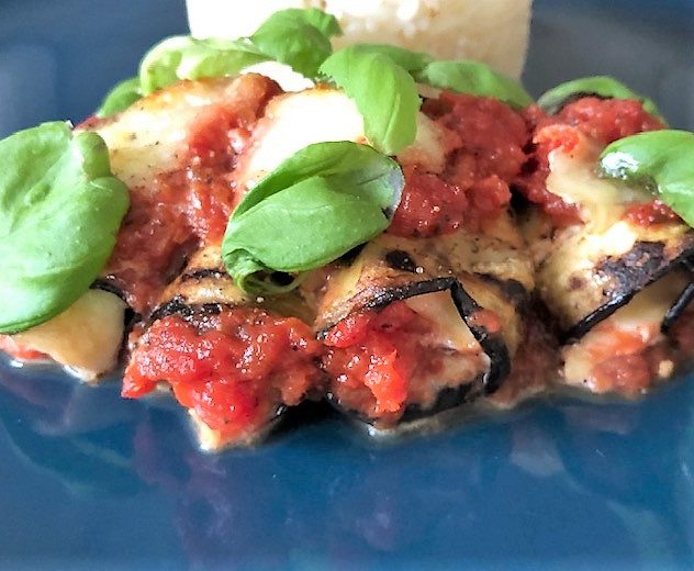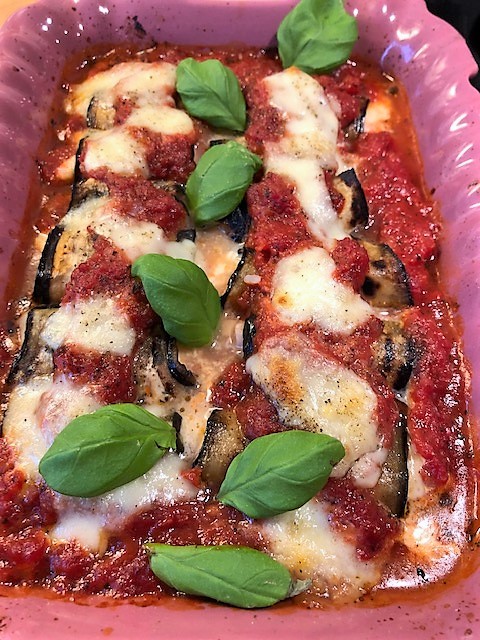 Skär fisken i mindre bitar. Lägg en fiskbit, lite mozzarella och ett basilikablad på varje aubergineskiva och rulla ihop. Lägg varje rulle i formen med tomatsås. Riv över resten av mozzarellaosten, salta, peppra och sätt in formen i ugnen ca 10-15 minuter tills osten smält och allt är varmt. Garnera med färsk basilika och servera med nykokt ris.