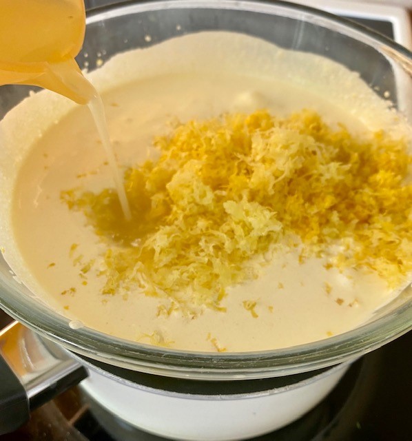 Ställ skålen över ett sjudande vattenbad och häll i citronjuice och citronskal. Rör runt med jämna mellanrum tills krämen tjocknar (tar cirka 15-20 minuter).