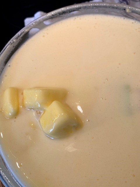 Skär smöret i mindre bitar och lägg i dem under omrörning. Rör runt tills smöret smält.