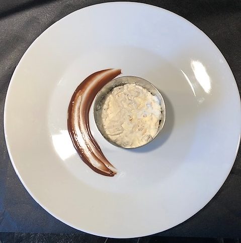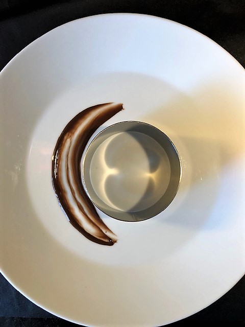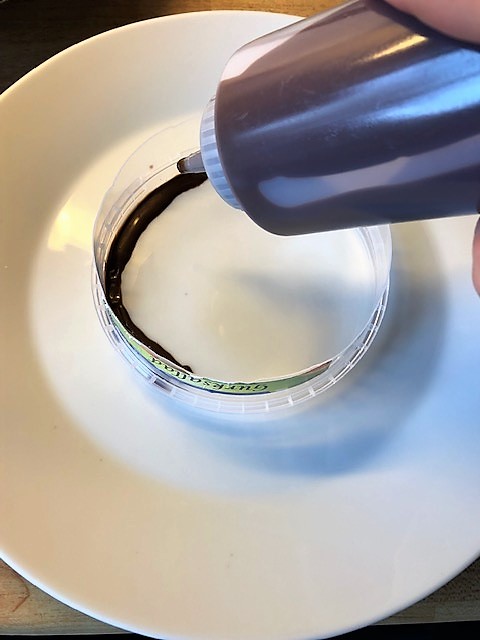 Vill man lägga en sträng chokladsås runt brukar jag använda en pipflaska och hälla lite sås runt kanten och sen dra med en liten sked så man får en bredare sträng. Strö sen på lite strössel där med.