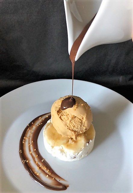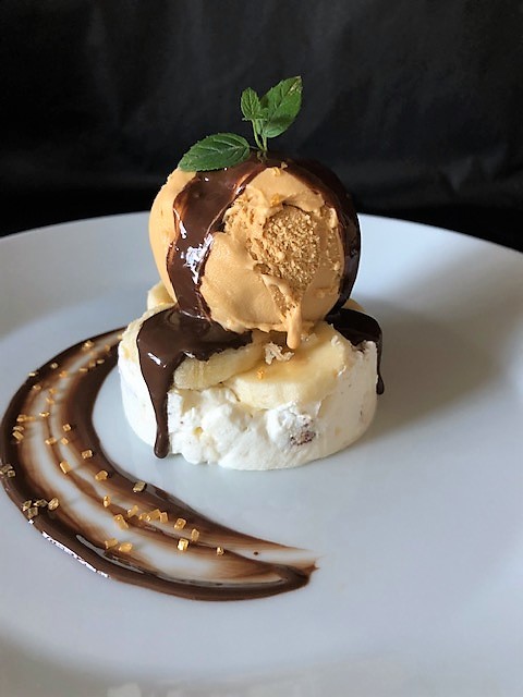 Vispa grädden. Bryt ner marängerna i den vispade grädden och blanda runt ordentligt. Skiva bananerna. Om du har en stansform (fungerar även med en plastburk med botten borttagen) placera den mitt på tallriken. Lägg maränggrädden i botten, lägg på bananerna i en cirkel, lägg på en skopa glass och lyft bort stansformen.