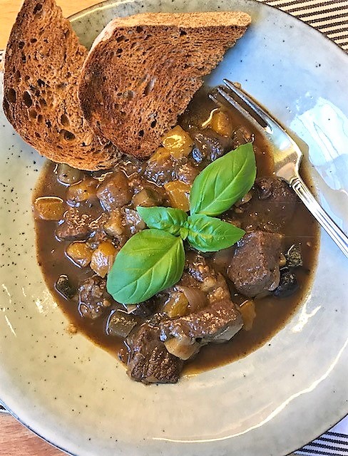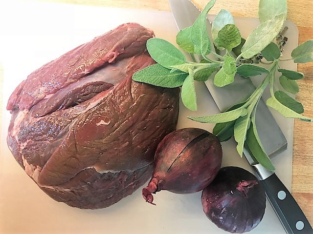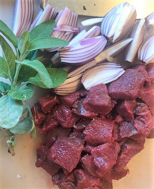 En god gryta med härliga smaker av salvia och rödvin. Grytan går att tillaga på många olika köttslag, högrev, kalvstek osv., men här använder jag hjortkött eftersom jag har mycket av den varan i min frys. Till grönsaksröran kan du använda vilka grönsaker du vill, välj det du tycker bäst om och du tycker passar.
