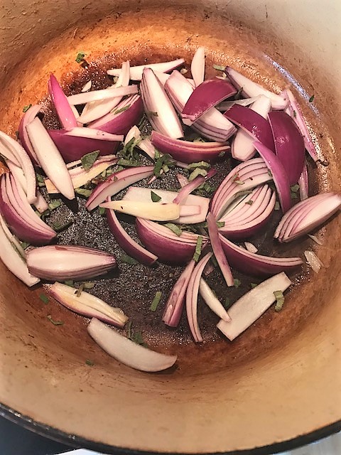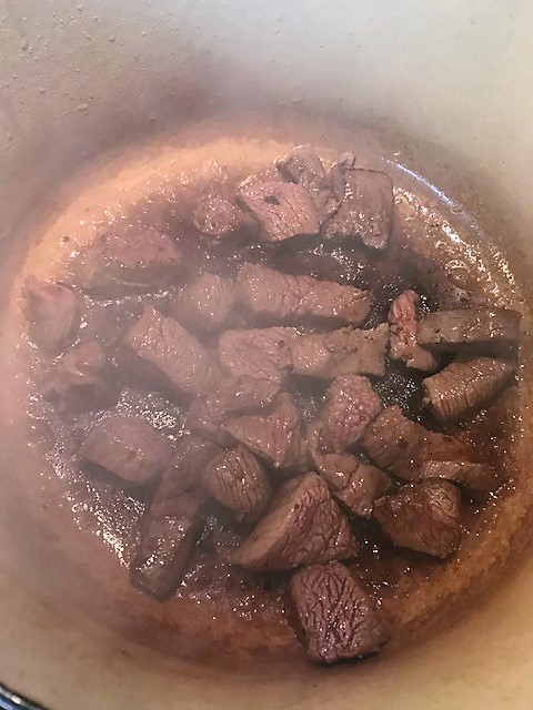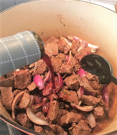 Putsa köttet och skär det i lagom stora bitar, ca 2×2 cm. Bryn köttet i omgångar i olivolja, lägg sen åt sidan. Bryn även lök och strimlad salvia några minuter, tillsätt tomatpurén samt köttet och stek under omrörning någon minut. Häll på vin och vatten, hälften av varje, så det täcker köttet samt fond från flaska. Låt koka upp, sänk värmen, låt puttra under lock 1-2 timmar tills köttet är mört.