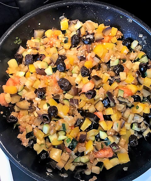 Under tiden steker du aubergine, zucchini, paprika och purjolök i olivolja tills allt börjar mjukna. Tillsätt sen vitlök, tomater och oliver och stek en liten stund till under omrörning. Smaka av med salt och peppar. Ställ sen åt sidan.