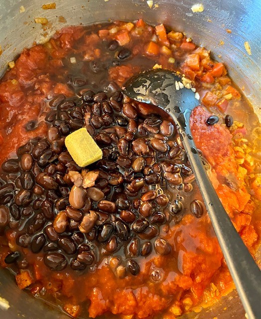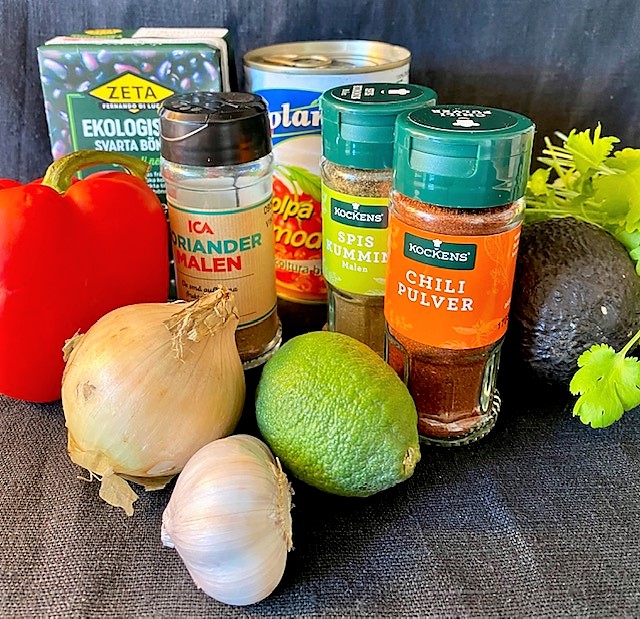 Hetta upp oljan i en panna. Tillsätt gul lök (spara 1 msk till guacamolen) och paprika. Låt fräsa under omrörning ca 10 minuter. I med vitlök, kryddor, krossade tomater och bönorna samt lagen de ligger i samt ½ burk vatten + buljongen. Lägg på ett lock och låt sjuda ca 15 minuter.