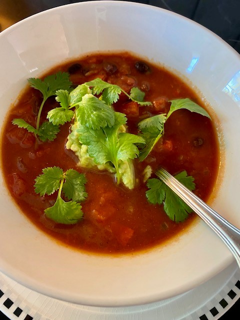 Kalorisnål, värmande och lite kryddig vegetarisk som toppas med en krämig guacamole.
