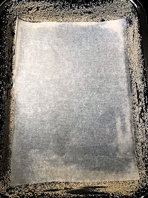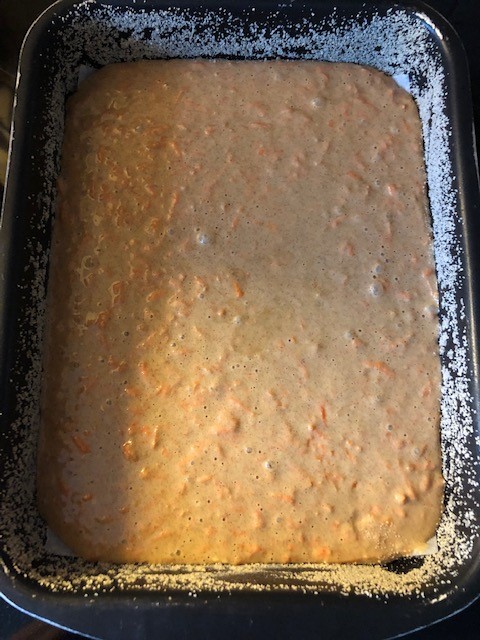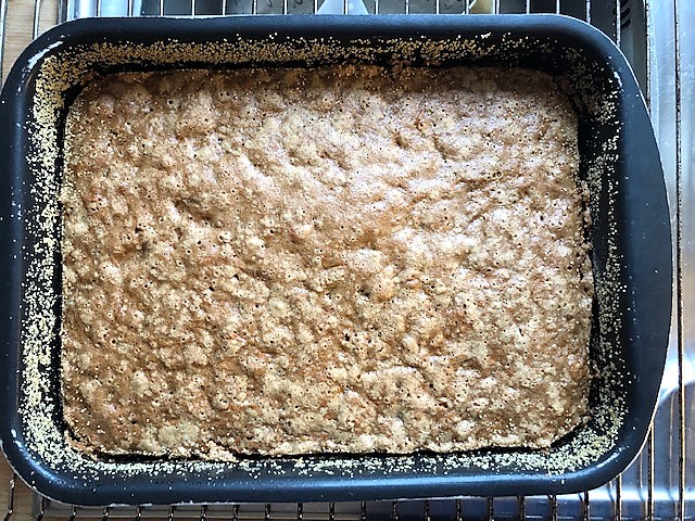 Smörj och bröa kanterna på en form med hög kant, ca 20×30 cm. Lägg ett bakplåtspapper i botten. Häll i smeten och grädda i mitten av ugnen ca 50 minuter. Låt svalna i formen.