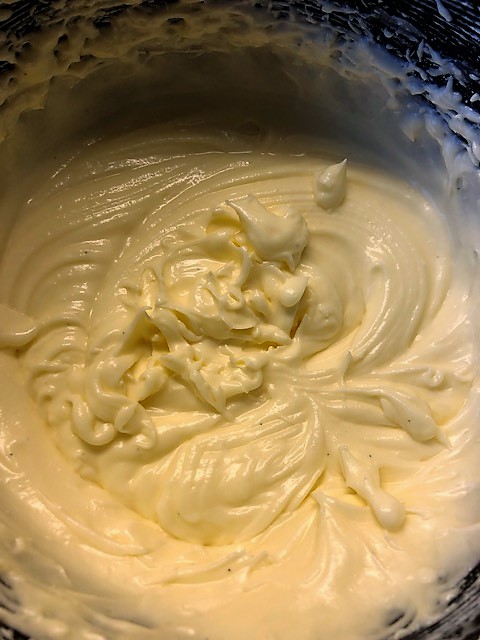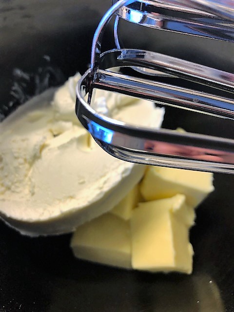 Vispa ihop smör och färskost till en vit och fluffig blandning. Tillsätt florsocker samt vaniljsocker och fortsätt att vispa tills det blir en fast och fin frosting. Förvara i kylskåp till kakan svalnat.