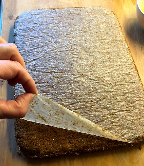 Tippa över kakan, upp och ner, på ett fat och ta bort bakplåtspappret.