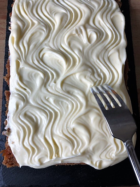 Bred på frostingen och gör gärna ett fint mönster med t.ex. en gaffel och sprinkla på apelsinsockret och servera!