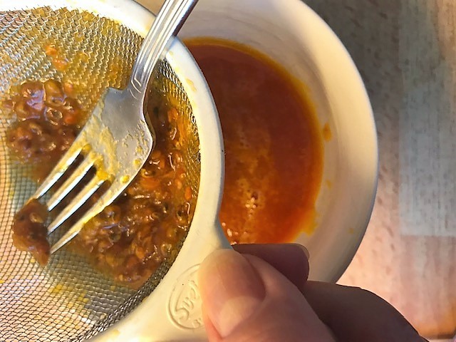 Skala kaktusfikonen och skär sen i bitar. Pressa fruktköttet genom en finmaskig sil, så bara kärnorna blir kvar i silen.