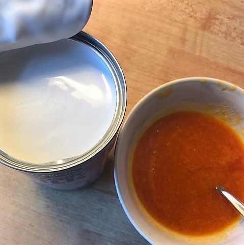 Blanda fruktköttet med kokosmjölk och lönnsirap. Smaka av så du får den sötma du vill ha. Värm gelatinpulver med 1 msk vatten i mikron några sekunder. Blanda sen ihop det med fruktröran. Häll upp i 4 serveringsskålar och ställ i kylen minst 4 timmar.