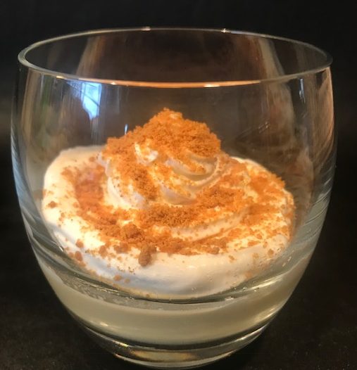 När det är dags att servera toppar du pannacottan med vispad grädde och strör på pepparkakssmulorna. Garnera ev. med lite mynta. Klart!