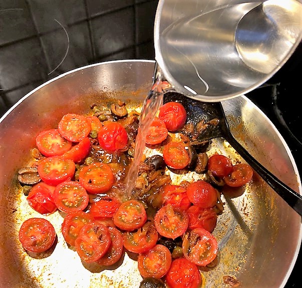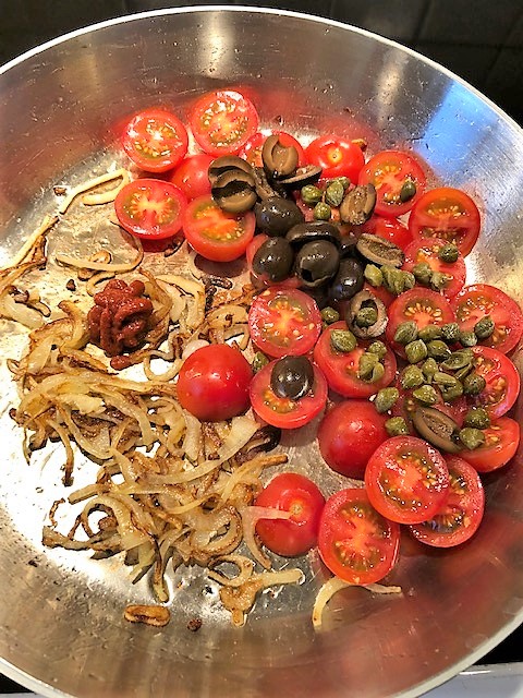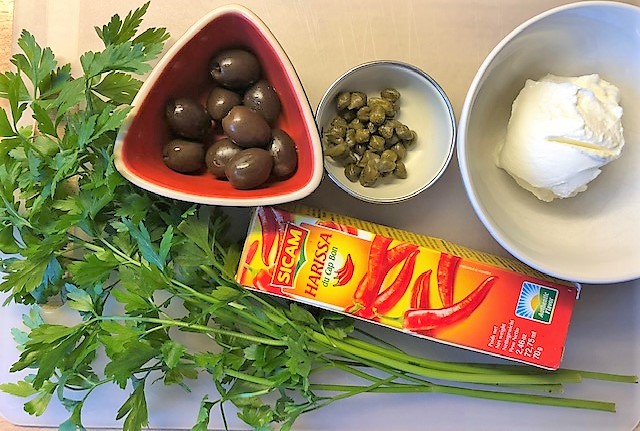 Tillsätt harissa, tomater, oliver, kapris och ½ tsk salt och låt puttra ihop 3-4 minuter under omrörning. Tillsätt 2 dl vatten och koka upp. Sänk sen värmen, lägg på locket och låt sjuda ca 10 minuter. Ta av locket och fortsätt småkoka ett par minuter till så att såsen tjocknar något. Rör i det mesta av persiljan och ta av från värmen.