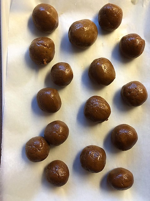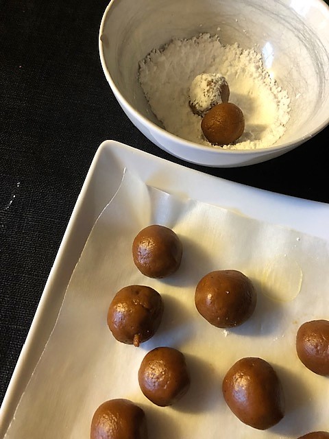 Smaka av och häll ev. på mer om du vill ha skarpare mintsmak. Gör runda bollar av smeten och rulla varje boll i florsocker. Klart! Förvara i kylskåp fram tills de ska serveras.