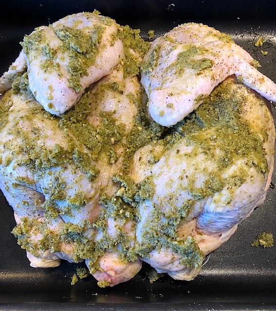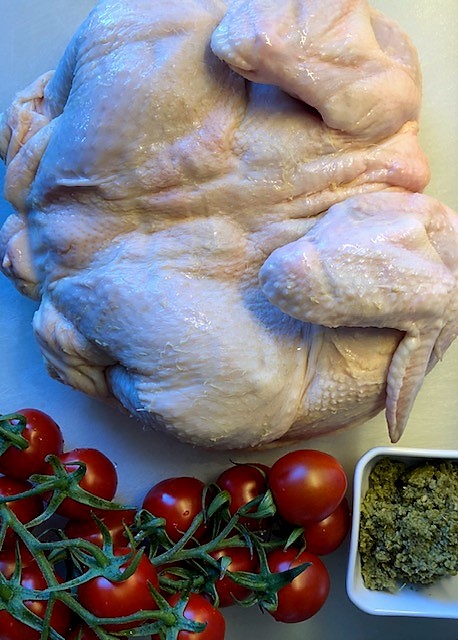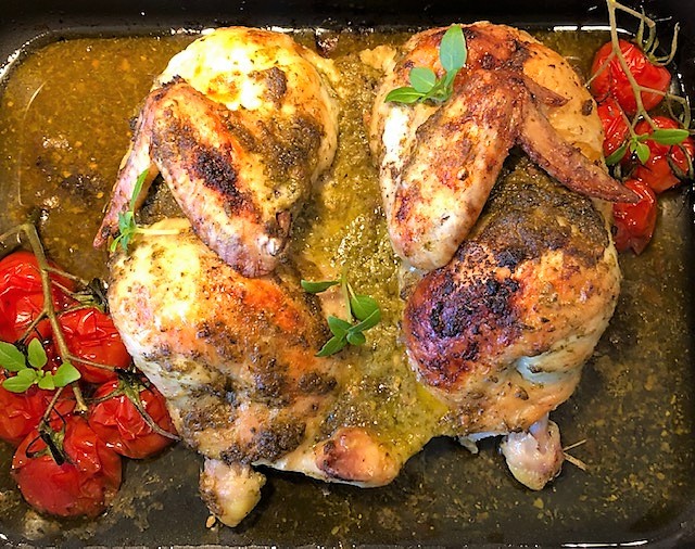 Värm ugnen till 200 grader. Dela kycklingen längs med bröstbenet och fläk upp den i en ugnsfast form. Gnid in kycklingen med pesto runt om och krydda med salt och peppar. Sätt in mitt i ugnen 30 minuter. Ta ut formen och lägg i tomaterna. Tillaga ca 30 minuter till tills kycklingen är färdig.