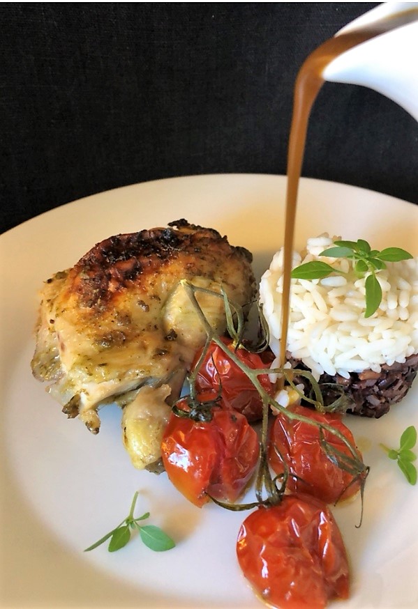Smakrik hel kyckling i ugn på bara 2 ingredienser. Servera med det tillbehör du gillar, jag valde en blandning av svart och vitt ris.