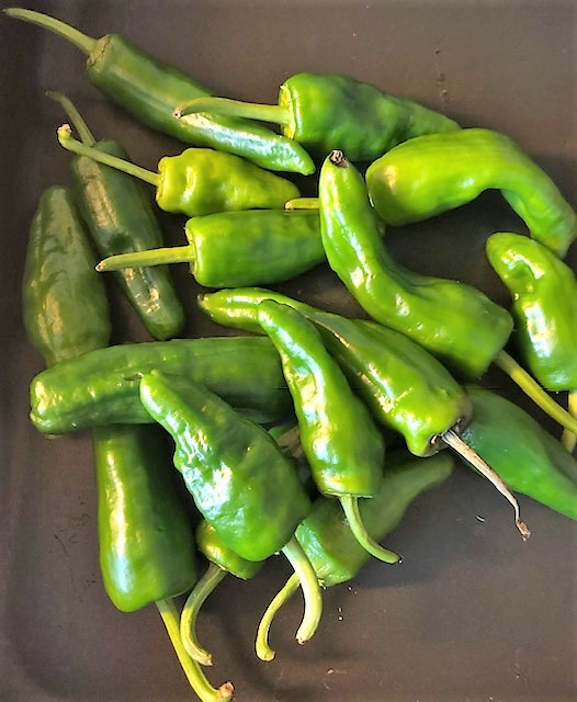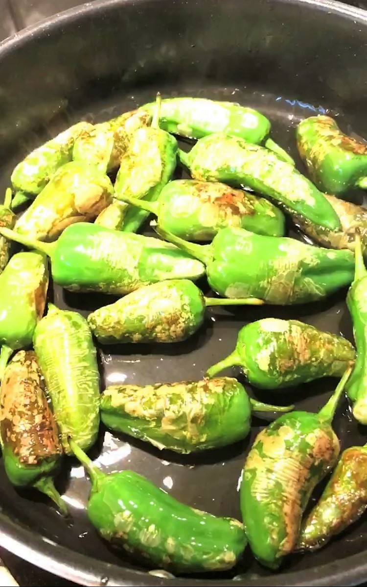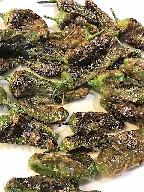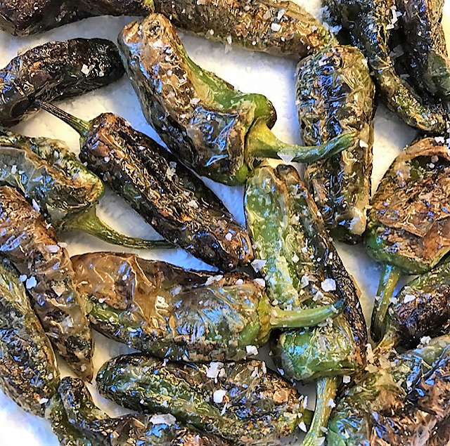 Hetta upp oljan i en panna med lock. Lägg i paprikorna (lägg på ett lock för det skvätter rejält) och skaka runt. När de är mörka men fortfarande lite spänstiga är de klara.