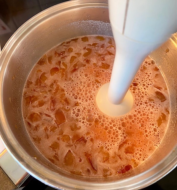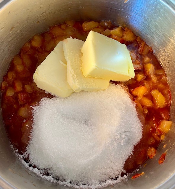 Tillsätt smör och socker och fortsätt att röra om tills sockret och smöret har smält.Ta av från värmen och purea plommonblandningen med en stavmixer eller i en vanlig mixer tills blandningen är så slät som möjligt.