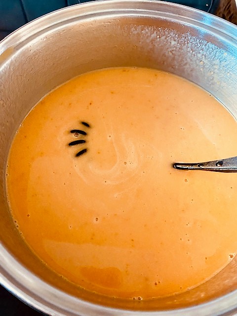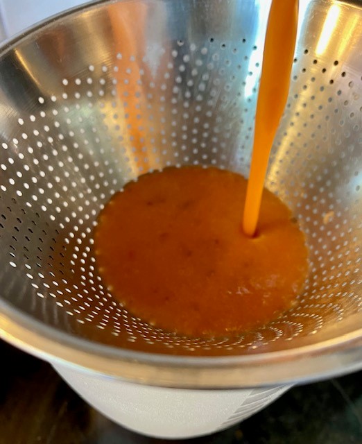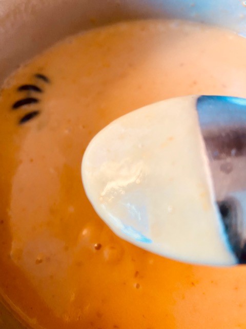 Sila blandningen i en finmaskig sil så att återstående bitar av skalet försvinner.Häll tillbaka i kastrullen och värm under ständig omrörning tills curden tjocknar och lätt fastnar på baksidan av en sked. Tar ca 10 minuter.