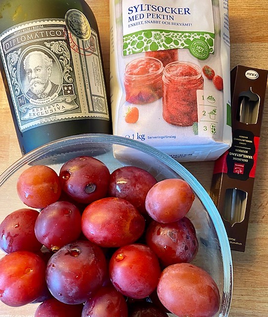 Lägg plommonen, syltsocker och vanilj, både stången och det urskrapade i en kastrull.
