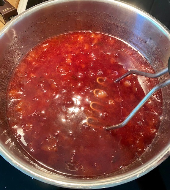 Tag av kastrullen och låt den stå en stund. Rör om då och då. Tillsätt rom. Jag brukar använda en potatisstöt att mosa den frukt som inte kokat sönder riktigt.
