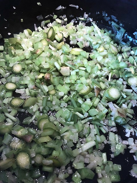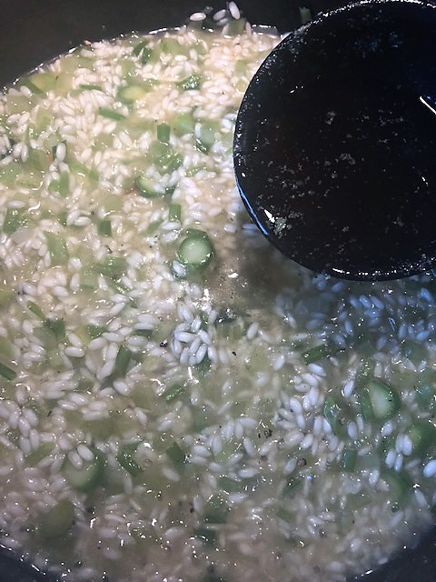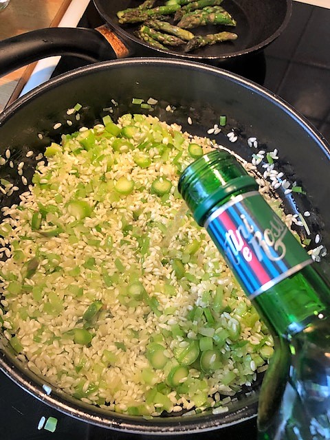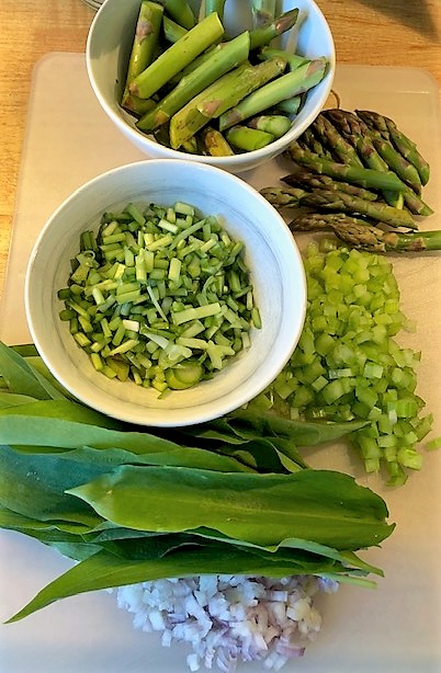 Värm upp oljan i en vid låg panna, typ traktörpanna. Tillsätt lök, vitlök och selleri, stek några minuter tills de mjuknar. Tillsätt sen riset, den tunt skivade sparrisen och ramslöksstjälkar, stek under omrörning tills riset börjar bli genomskinligt. Häll på vin eller vermouth och låt koka in i riset under fortsatt omrörning. Salta och peppra lätt. Tillsätt sen buljong skopa för skopa, låt buljongen koka in innan du tillsätter mer, låt puttra på medelvärme tills all buljong är slut. Konsistensen på riset ska fortfarande vara krämig och riset kännas genomkokt när det är klart. (Tar ca 15-20 minuter).