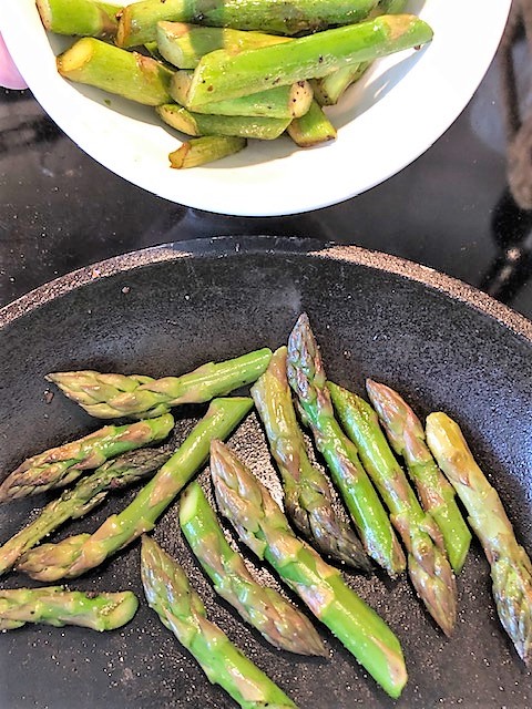 Ansa sparrisen och skär av 1/3-del nertill och skiva tunt. Dela resten på hälften och grilla lätt i en stekpanna.