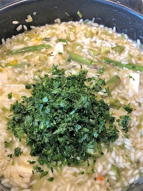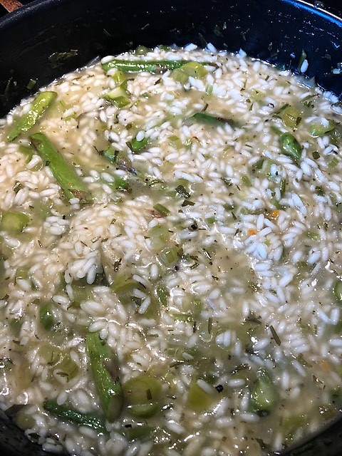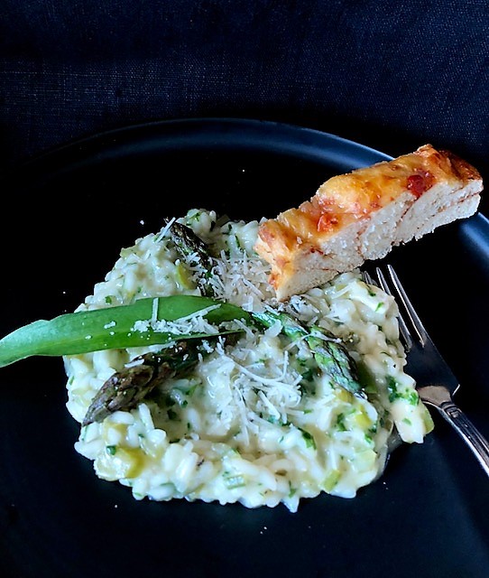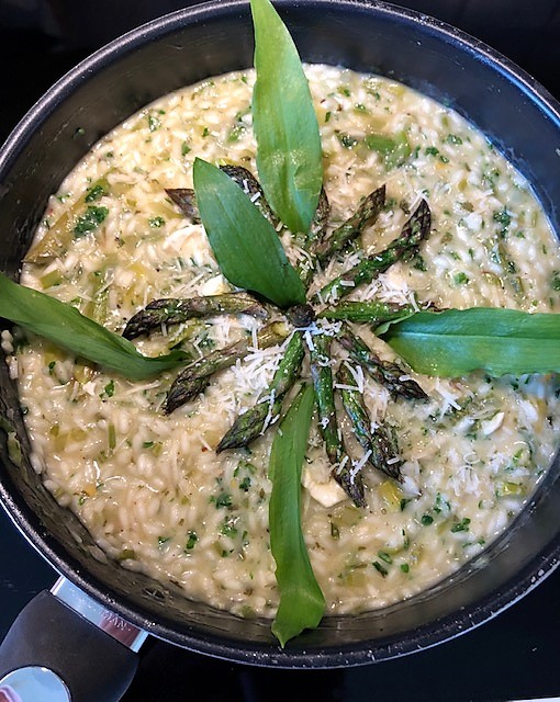 Krämig och god risotto med ramslök, sparris och getost som kryddats varsamt med dragon. Riktiga smakkamrater allihop.