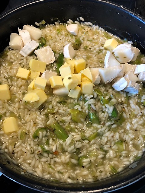 Ta kastrullen från plattan och tillsätt smör, getost, hälften av sparrisen, hackade ramslöksblad och rör om så allt blandas. Smaka av med mer salt och peppar om du tycker det behövs. Lägg på ett lock och låt gärna stå några minuter.