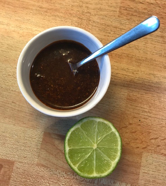 Mixa under tiden resten av sweet chilisåsen med soja och jordnötssmör. Pressa i limesaft efter smak och en liten skvätt vatten och ställ åt sidan.