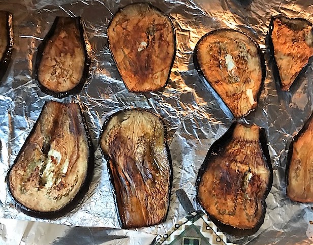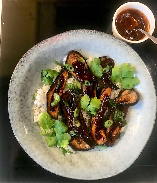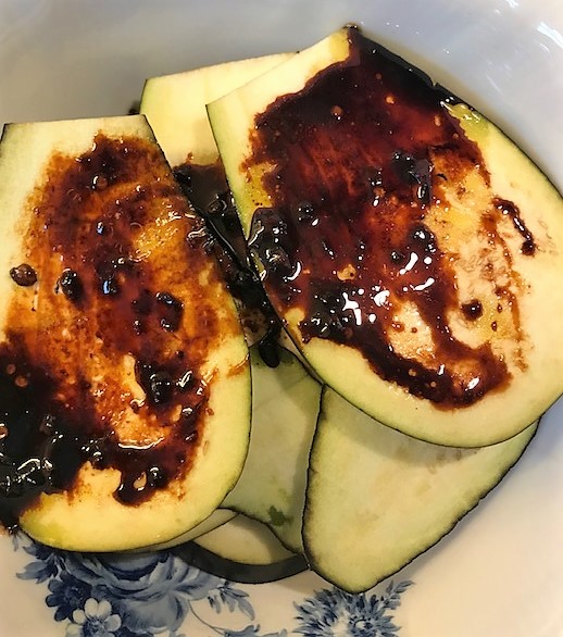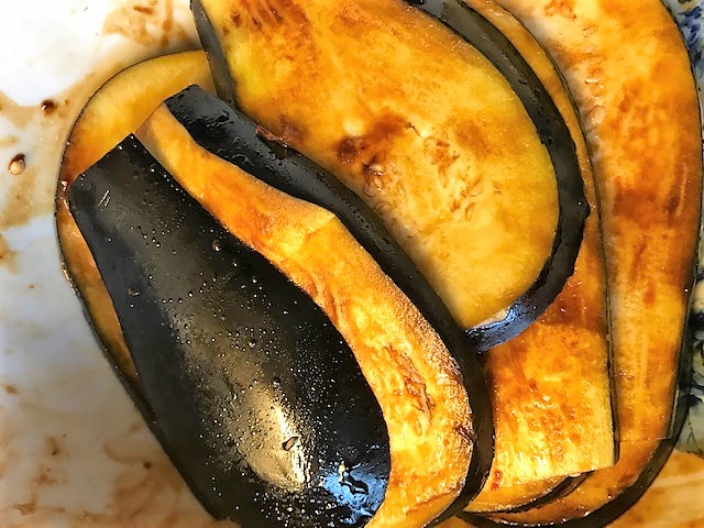 Värm ugnen till 175 grader. Blanda olja och ½ msk sweet chilisås och 1 msk soja till en marinad. Skär auberginen på längden i skivor. Täck aubergineskivorna med marinaden och lägg ut dem på en ugnsbricka försedd med bakplåtspapper. Tillaga mitt i ugnen ca 30 minuter.