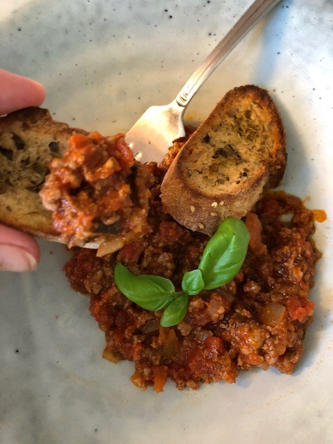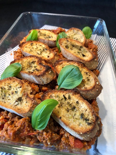 Det finns många varianter på denna köttfärsrätt. Jag har valt att lägga färsen i en ugnsfast form och lägga ört- och vitlöksbröd på toppen och gratinera hela härligheten en stund i ugnen så bröden blir riktigt frasiga och goda.
