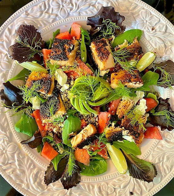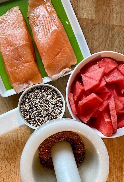 Salladen består av quinoa, vattenmelon, fetaost, avokado och salladsblad.
