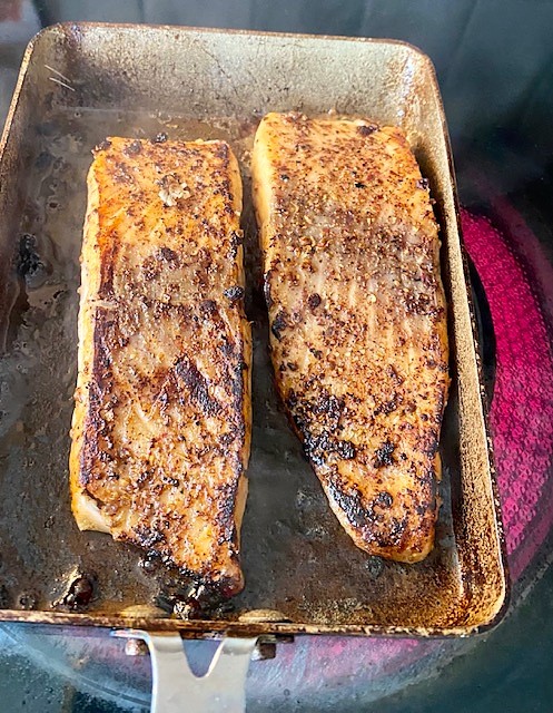 Stek laxen på hög värme i smör tills den är klar. Den får gärna vara rosa i mitten. Skär den sen i mindre bitar.