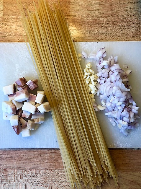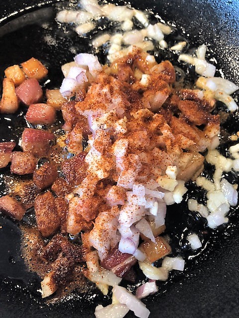 Koka spaghettin enligt instruktion på paketet. Stek under tiden fläsket i en teflonpanna tills et fått fin färg. Tillsätt schalottenlök, vitlök, paprikapulver och stek ett par minuter till. Tillsätt krossade tomater och låt koka ihop, under omrörning, tills överflödig vätska kokat bort.