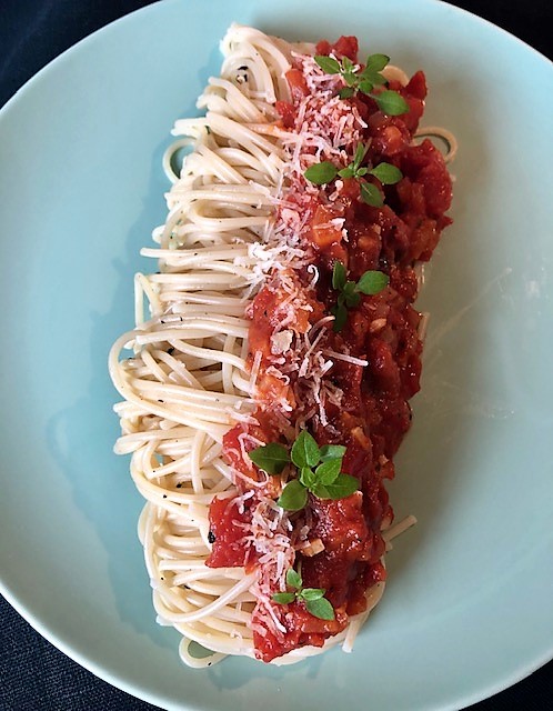 Häll av pastavattnet och servera med tomatsåsen och lite riven parmesanost!