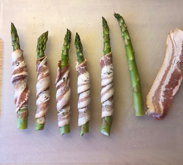 Hetta upp ugnens grillelement, ca 225 grader. Bryt av den träiga nedre delen på varje sparris. Linda in varje sparris i en halv skiva bacon. Lägg på en bakplåt och tillaga högt upp i ugnen ca 15 minuter tills baconen är krispiga och fått fin färg.