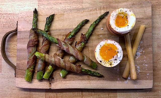 Servera ägget halverat med sparrissoldaterna, brödet och lite flingsalt och svartpeppar.