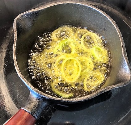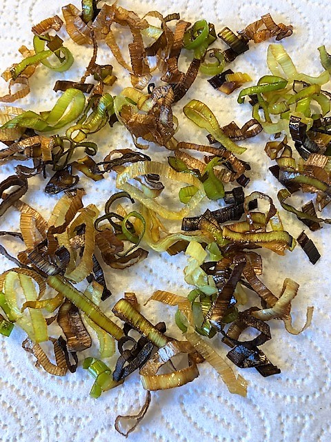 Hetta upp oljan i en liten kastrull (till ca 140 grader) och lägg i purjolök i omgångar och fritera till den blir krispig. Låt rinna av på hushållspapper.