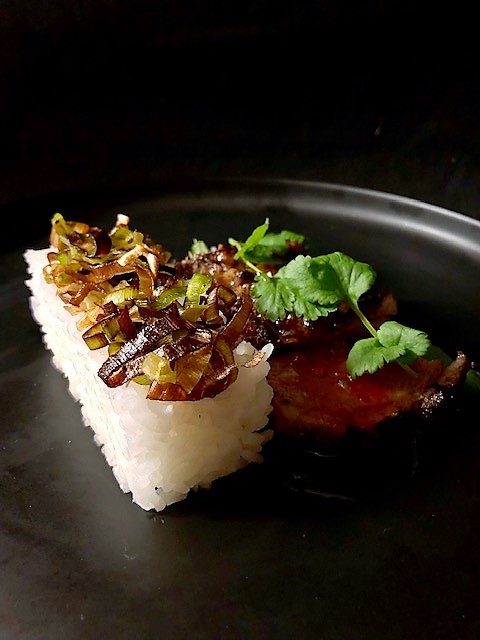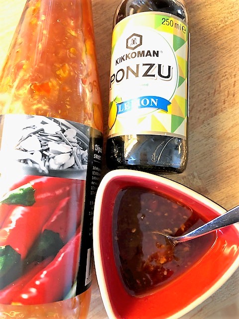 Blanda sweet chili med Ponzu. Skär upp ankbröstet och servera med ris, friterad purjolök, såsen och färsk koriander.