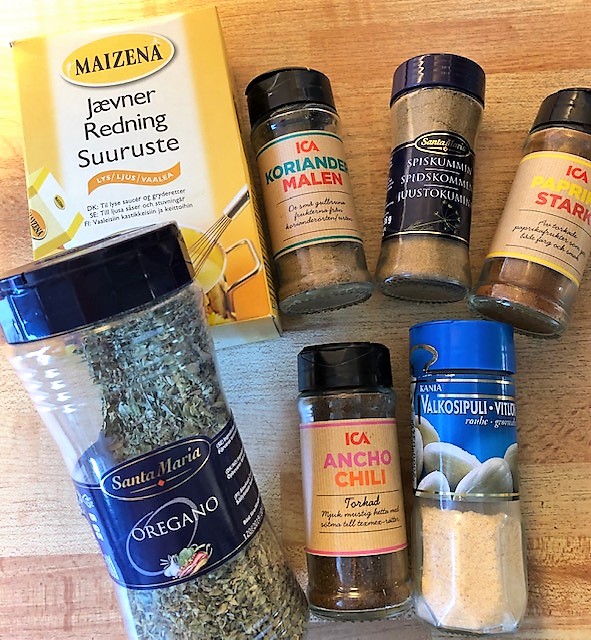 Jag brukar göra min egen tacomix. Det blir det billigare och man slipper en massa onödiga tillsatser och E-ämnen. Välj själv vilken styrka du vill ha på mixen genom att variera med mild eller starkt paprikapulver. Vill man ha riktigt stark smak kan man även tillsätta cayennepeppar. Variera mer genom att använda olika typer av chilipeppar. Jag tycker det är gott att använda ”ancho style”, med smak av lakrits, kaffe och russin.